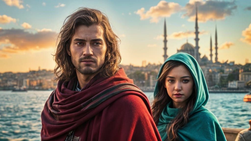This image shows a 35-year-old man with long, wavy brown hair and gray-brown eyes in a burgundy cloak, standing next to a girl in turquoise, against a Bosphorus sea backdrop with a fantasy city and mosque, rendered in 3D with dramatic lighting.