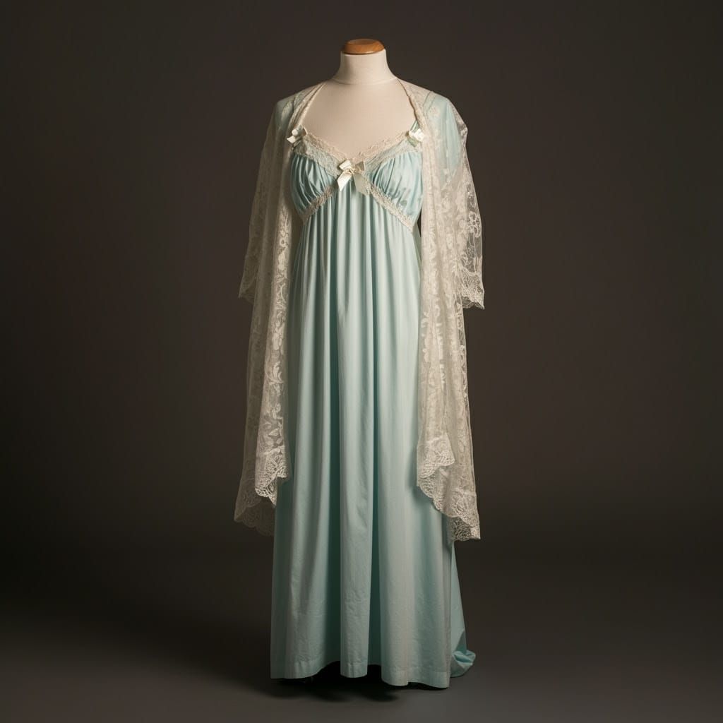 This image features a lavish, pale blue nightgown draped elegantly on a Victorian-era dress form, with a full, gathered skirt and delicate lace stole, evoking the Pre-Raphaelite style and the dreamy quality of John William Waterhouse's art.