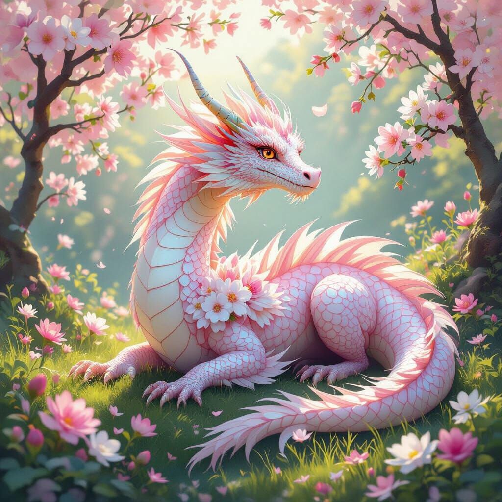 A light pink iridescent dragon covered in pink and white flowers, set in a sunlit spring landscape. The image features a dreamy ambiance with a painterly style and soft bokeh.