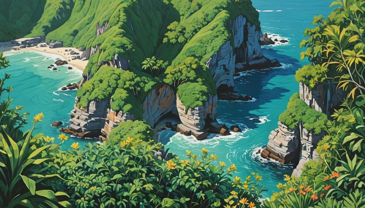 A vibrant vista of tropical cliffs rising from turquoise ocean waters. Emerald foliage and tropical flowers accent the rocky shores. Sunlight casts long shadows in a David Hockney inspired style.