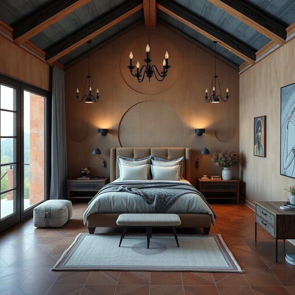 This image showcases a stunning master bedroom in a villa with vaulted ceilings, terracotta floors, and a comfortable king-size bed in warm earthy tones, rendered in a futuristic aesthetic with intricate details and rich textures.