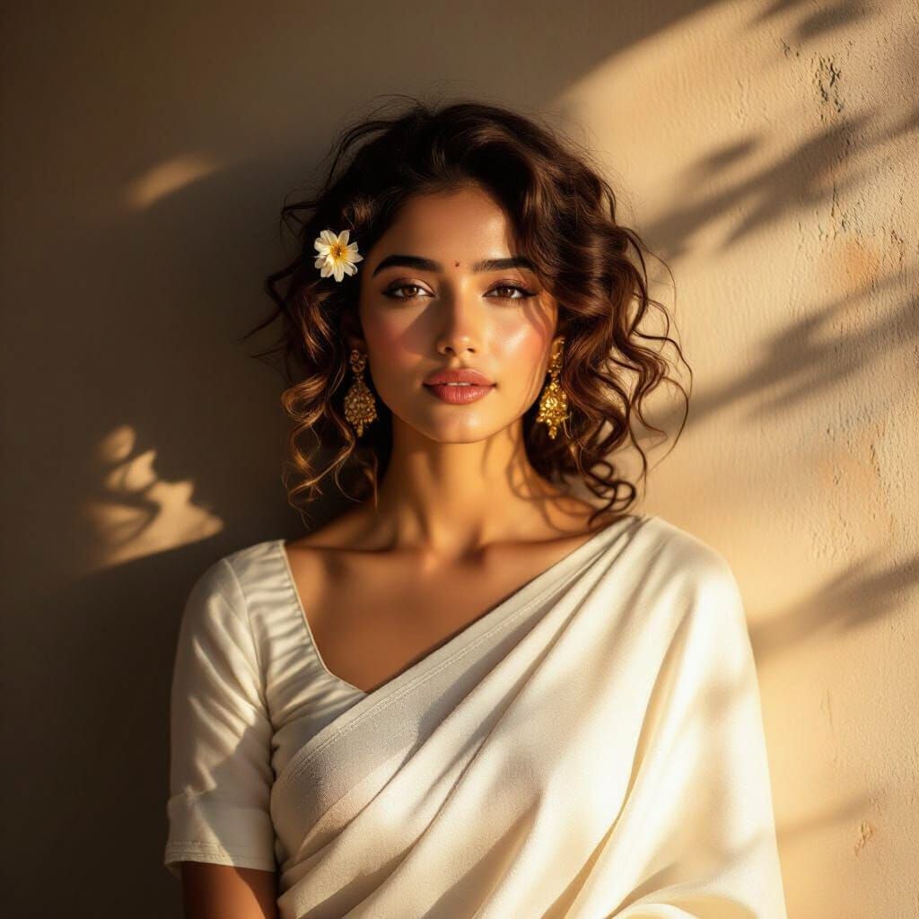 A cinematic portrait of a woman in a white saree with soft brown curls. The image features warm golden lighting, deep shadows, and a moody yet happy expression, evoking a 90s romantic film still.
