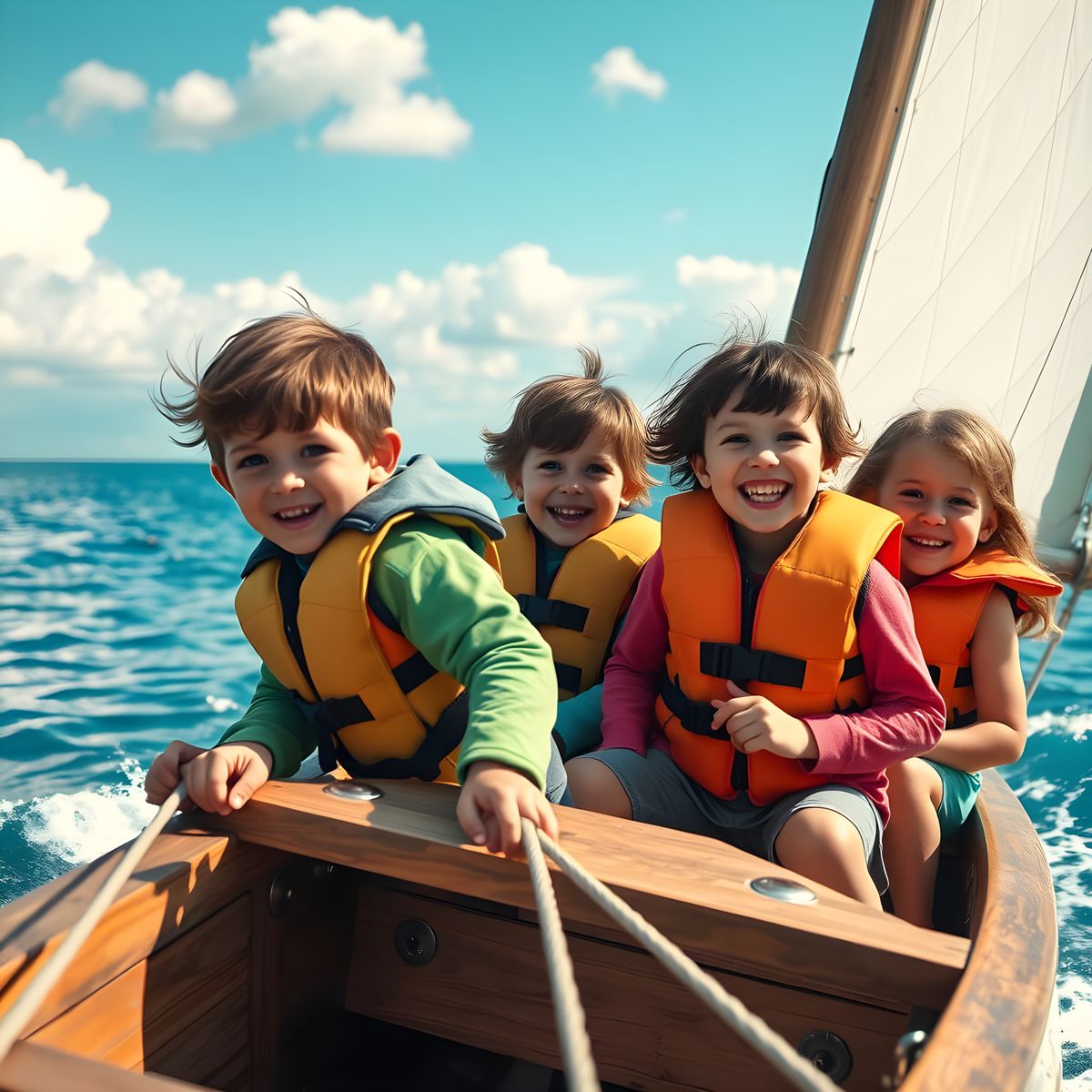 This image shows young children joyfully sailing on a small wooden boat under a clear sky. The scene is captured in vibrant colors, giving it a realistic and heartwarming appeal.