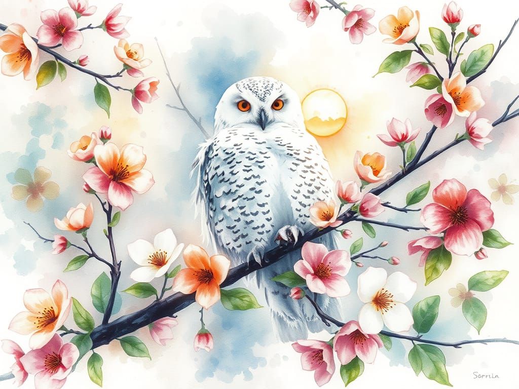 This image shows a beautiful watercolor painting of a snow owl perched on a lush spring branch surrounded by vibrant flowers and lush vegetation, created with transparent and delicate layers in a maximalist style.