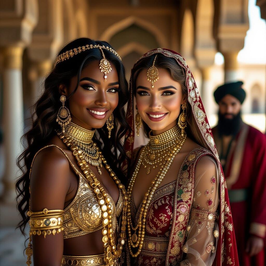 This image shows two women, one dark-skinned and the other fair, in elaborate futuristic clothing inside a palace. The detailed digital photograph features soft, natural lighting and a cinematic atmosphere.
