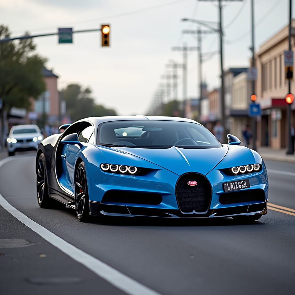 This image shows a Bugatti Chiron speeding through Fremantle, Western Australia. The luxury sports car contrasts with the urban streets in this vibrant photo.