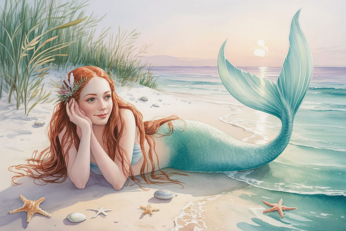 This image shows a mermaid with pale skin lounging on a white sand beach. The watercolor painting captures her auburn hair adorned with shells and seaweed, under soft sunlight with a hazy sunset.