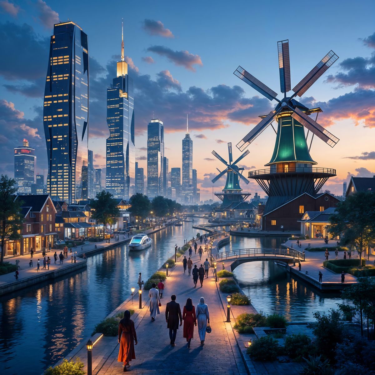 This image shows a futuristic cityscape blending Surinamese and Dutch elements at dusk. Sleek skyscrapers and advanced windmills line canals, while diverse people stroll along illuminated paths in blended modern and traditional attire.