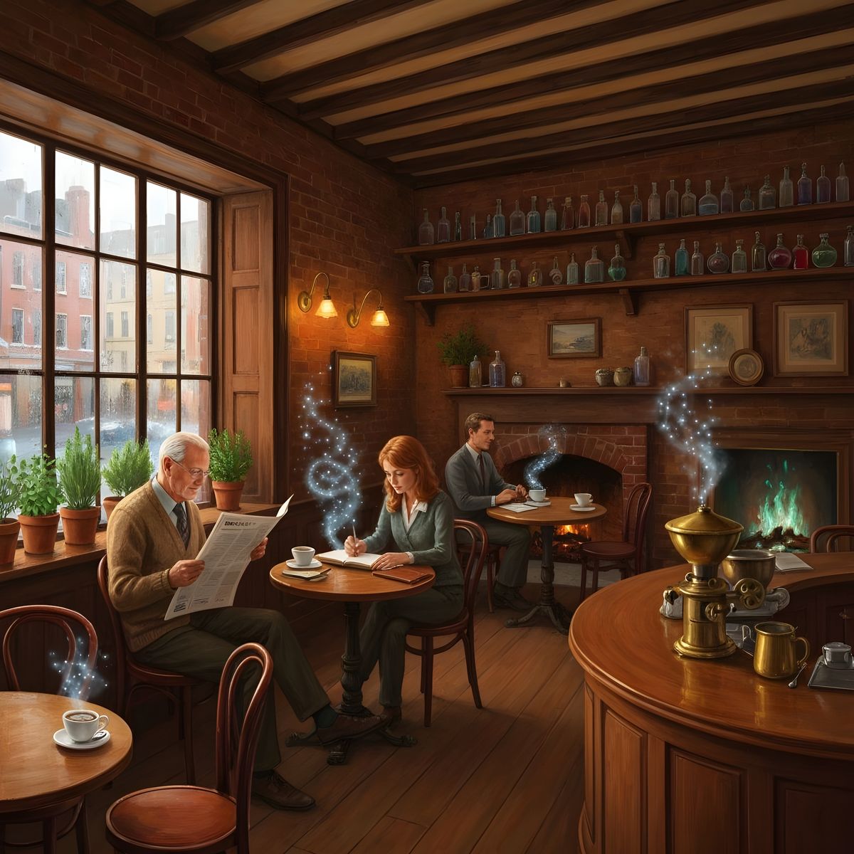 This image depicts a warm, impressionist oil painting of a cozy cafe interior. Patrons enjoy the intimate atmosphere as their coffee cups emit luminescent steam forming constellation patterns.