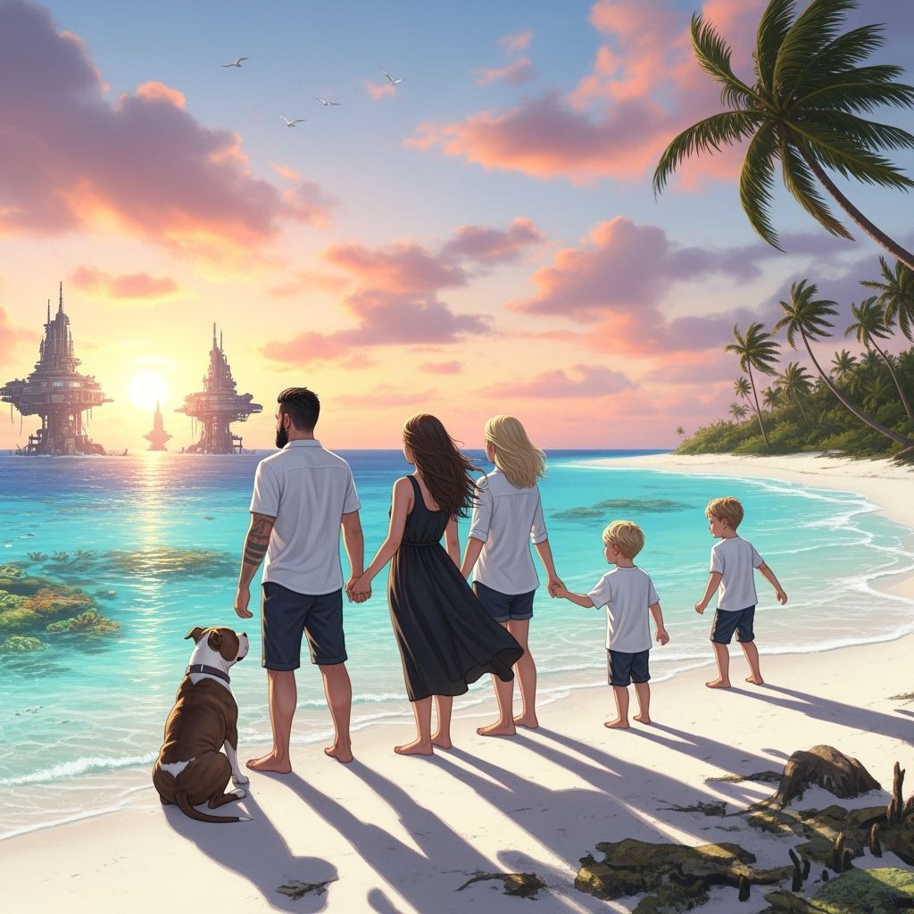A vibrant image of a family with their dog on a Maldives beach. The art style evokes a blend of surreal and serene realism, with rich colors enhancing the tranquil scene.