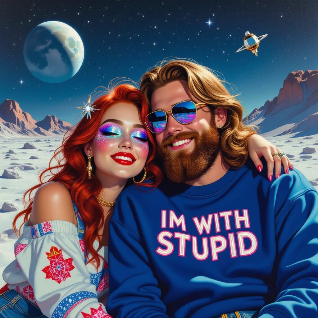 Curvy Canadian Gen-Z girl with glittery cosmic makeup, soft red lip stain, trendy outfit, rests head on shoulder of laughing man with long red hair, royal blue "IM WITH STUPID" sweatshirt, beard, sunglasses, amidst lunar craters, apollo lander, in Simon Stalenhag's gritty realism, Syd Mead's neon futurism, ...