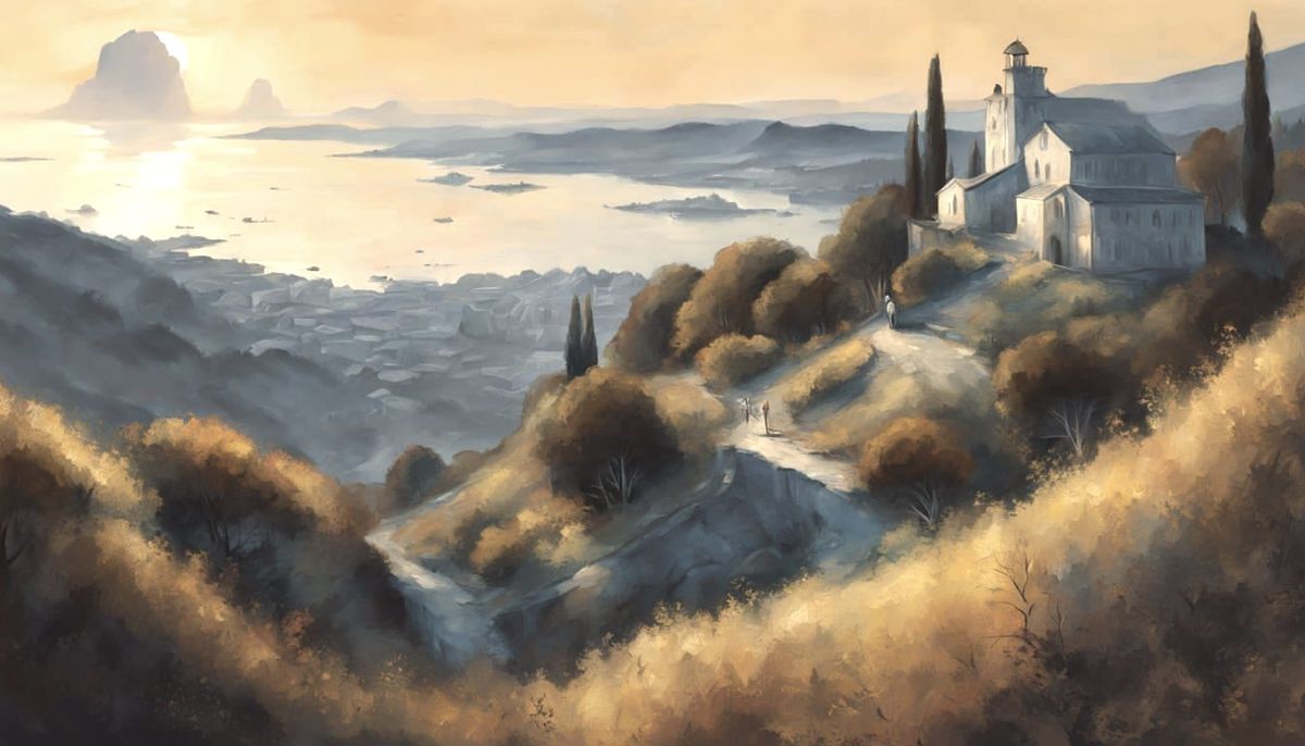 A scenic oil painting of Corfu, Greece, in the style of a 19th-century landscape. The low-contrast image features intricate details, dramatic side lighting and a muted color palette.