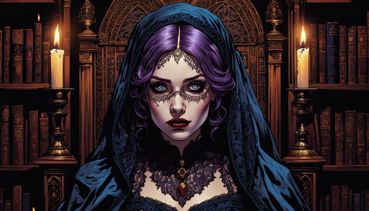 A striking picture of a gothic vampire woman with purple hair and blue eyes in a candlelit library. The image is rendered as a detailed comic book illustration with vibrant colors.