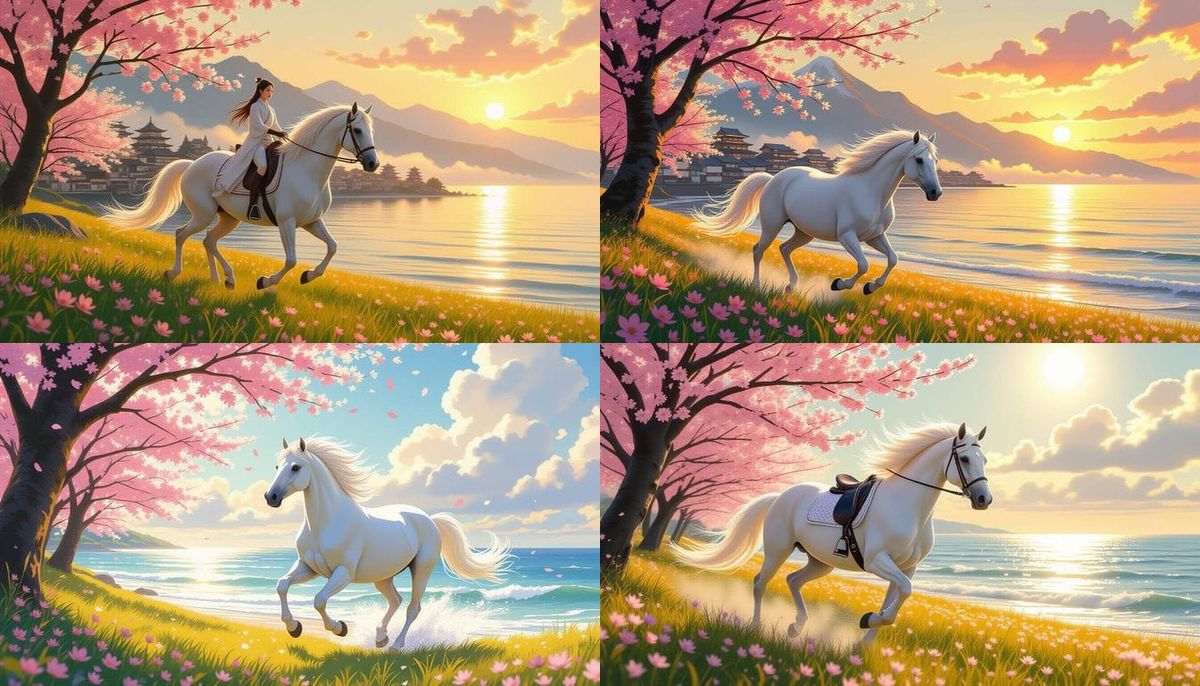 This image shows a majestic white horse galloping through a field of blooming cherry trees by the sea. Golden waves reflect sunset light in this fantasy scene reminiscent of traditional Japanese art.