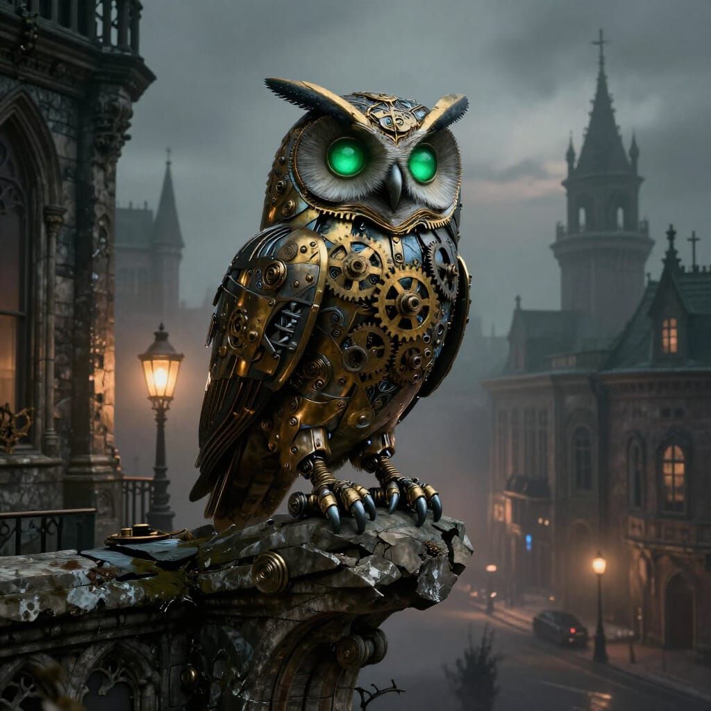 This image shows a detailed mechanical owl with glowing eyes on a gargoyle, watching over a gas-lit Victorian city in thick fog. It evokes a dark, mysterious atmosphere.