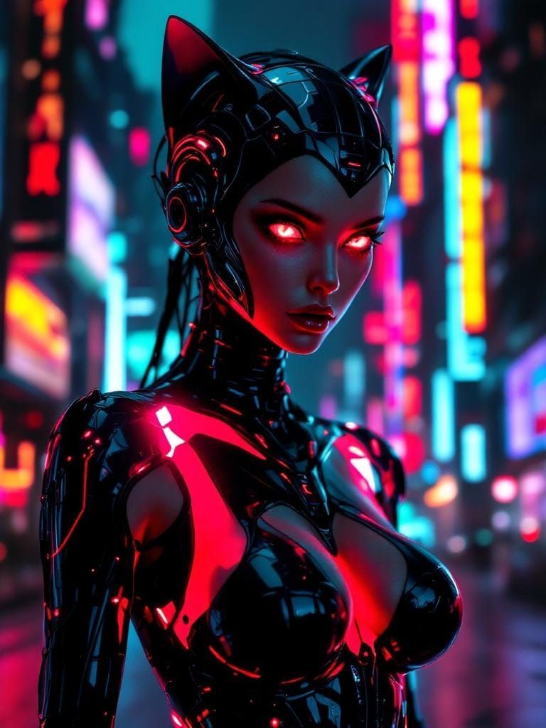 A striking picture of a cybernetic woman with glowing red eyes in a black catsuit. The image is set in a dark, neon-lit cityscape, with a futuristic, industrial aesthetic.