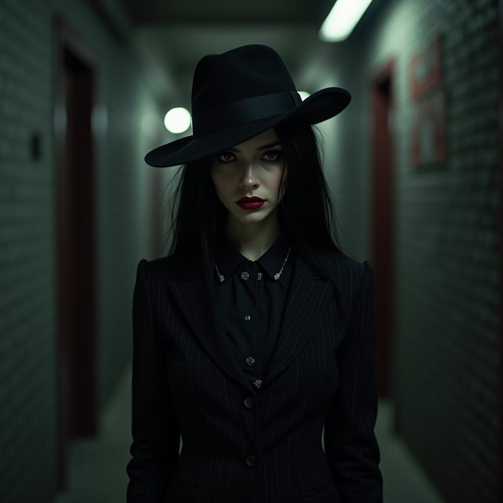 This image shows a gothic woman in a pinstripe suit and fedora, standing in a dark alley. The photorealistic style features high contrast and muted colors, reminiscent of film noir.