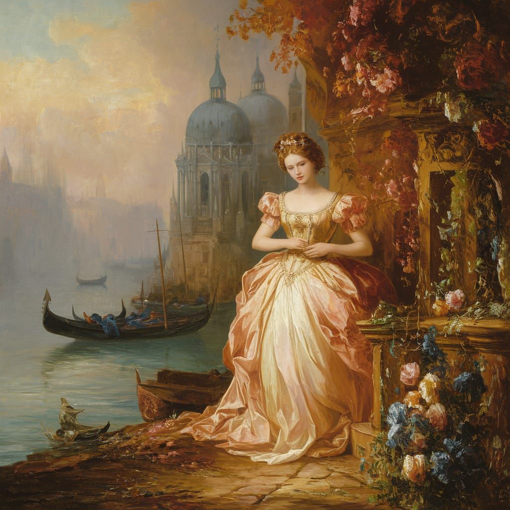This image shows a beautiful young woman in a misty Venetian landscape. The artwork evokes a 19th-century oil painting with hyperdetailed elements and soft, warm colors.