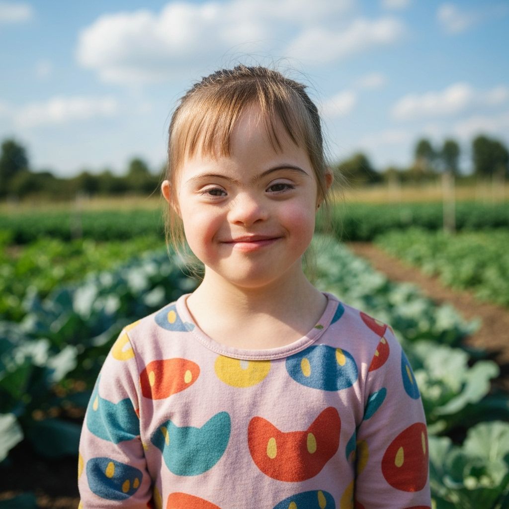 This photorealistic image shows a happy 5-year-old girl with Down syndrome smiling in a colorful vegetable garden. Natural light and shallow depth of field highlight her joyful personality and create a warm, authentic atmosphere.