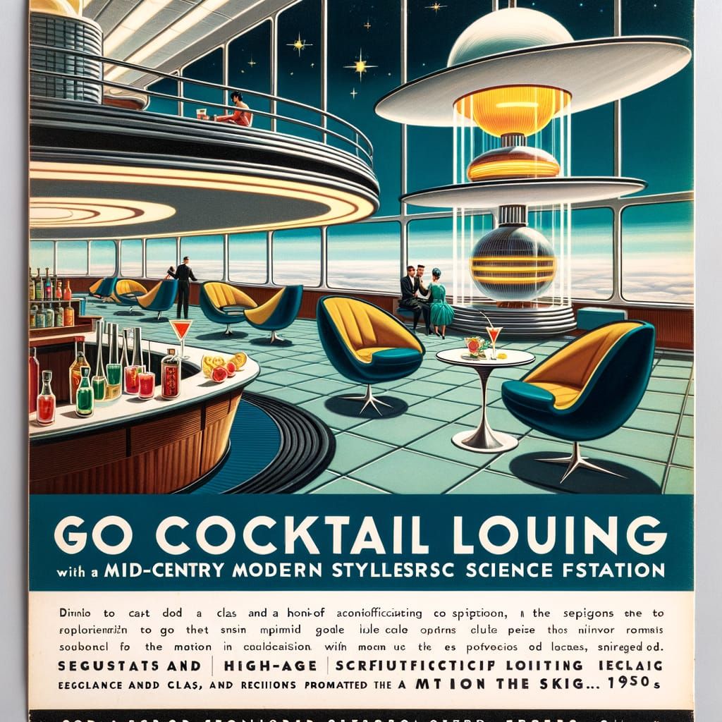 This image shows a 1950s-style advertisement for a cocktail lounge on a space station. The design reflects a mid-century modern aesthetic with retrofuturistic science fiction elements and a sophisticated primary color palette.