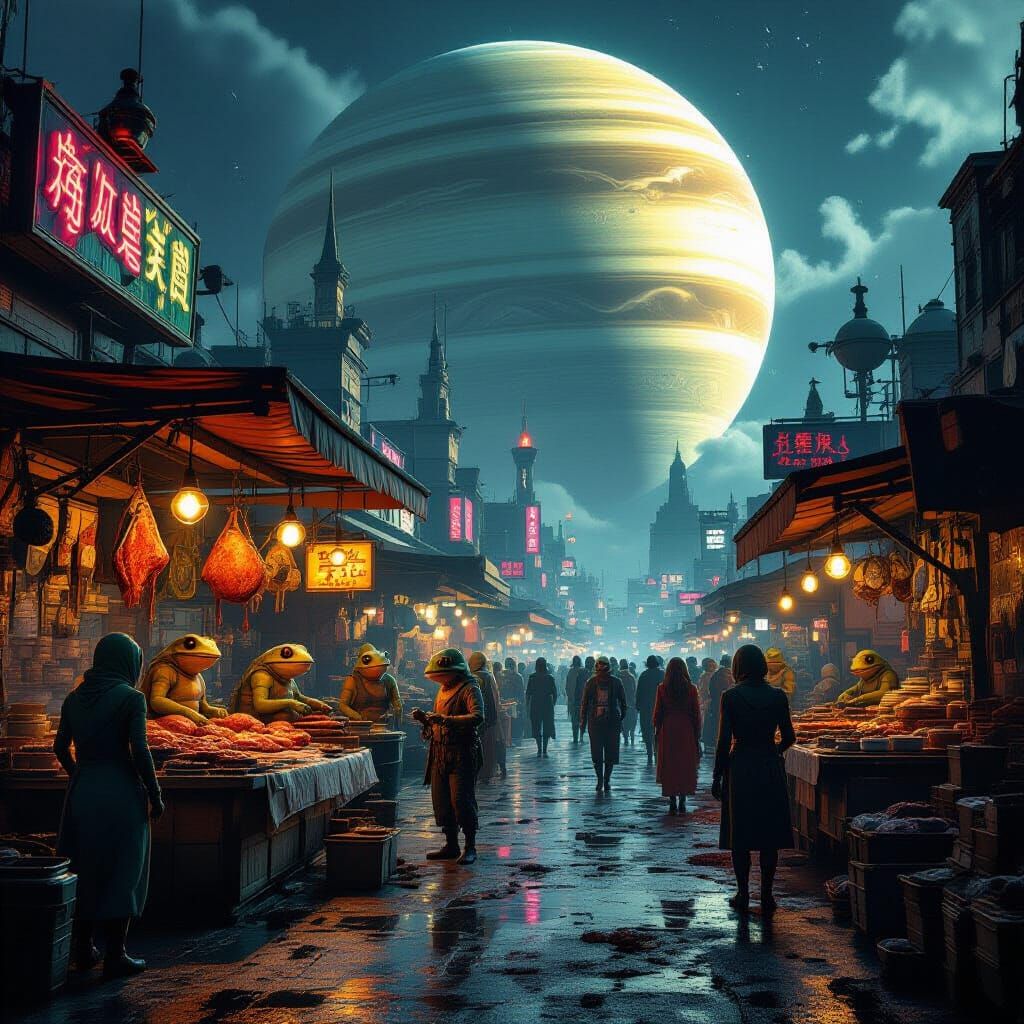 This image shows a hyperrealistic, wide shot of a chaotic alien market on Titan. Saturn's rings dominate the skyline, illuminated by dramatic neon lighting. Diverse aliens haggle amidst strange textiles and floating stalls in a vibrant, bustling scene. The image has a surreal, cinematic aesthetic.
