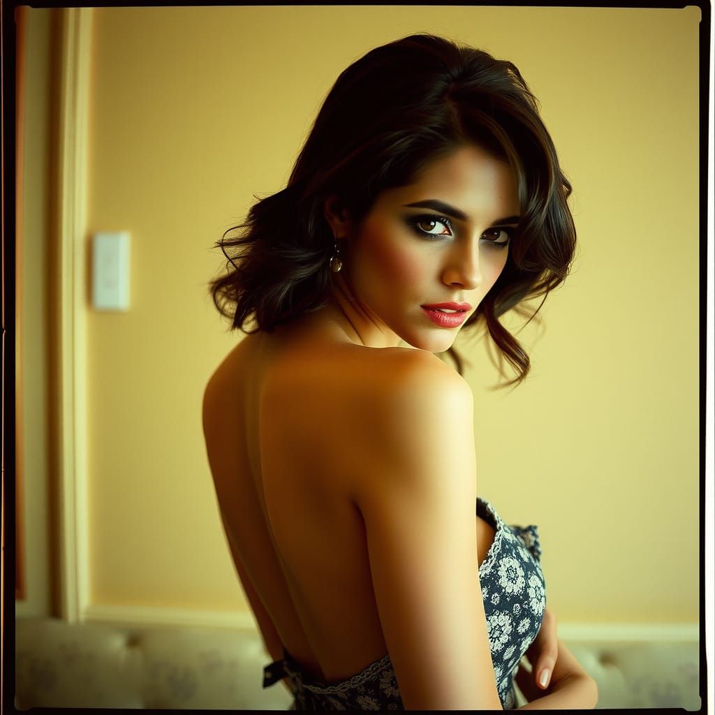 This image shows a beautiful, sensual tanned woman posing elegantly. The photograph features cinematic lighting and a warm, sophisticated aesthetic reminiscent of film photography.