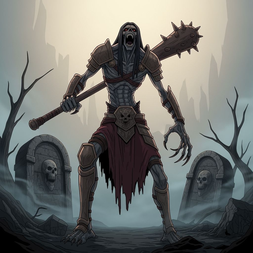 A lean, 7 ft tall warwraith in tattered armor stands in a tomb, wielding a club. Its skeletal claws and sharp teeth are visible as its scream echoes. Features manga-inspired, cel-shaded art.