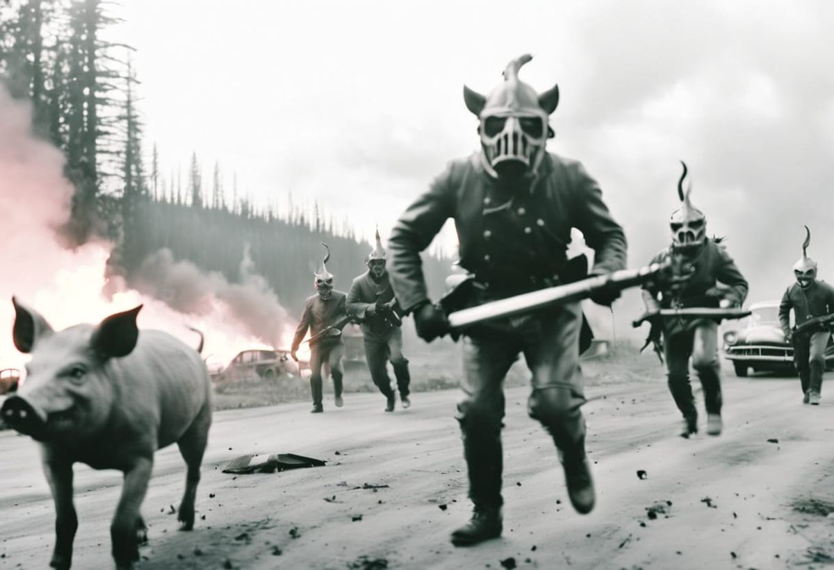 This image shows a surreal scene of a devil destroying a parking lot while pigs celebrate amidst burning cars and twisted metal. The artwork features hellish colors, dark clouds, and a divine horror aesthetic.