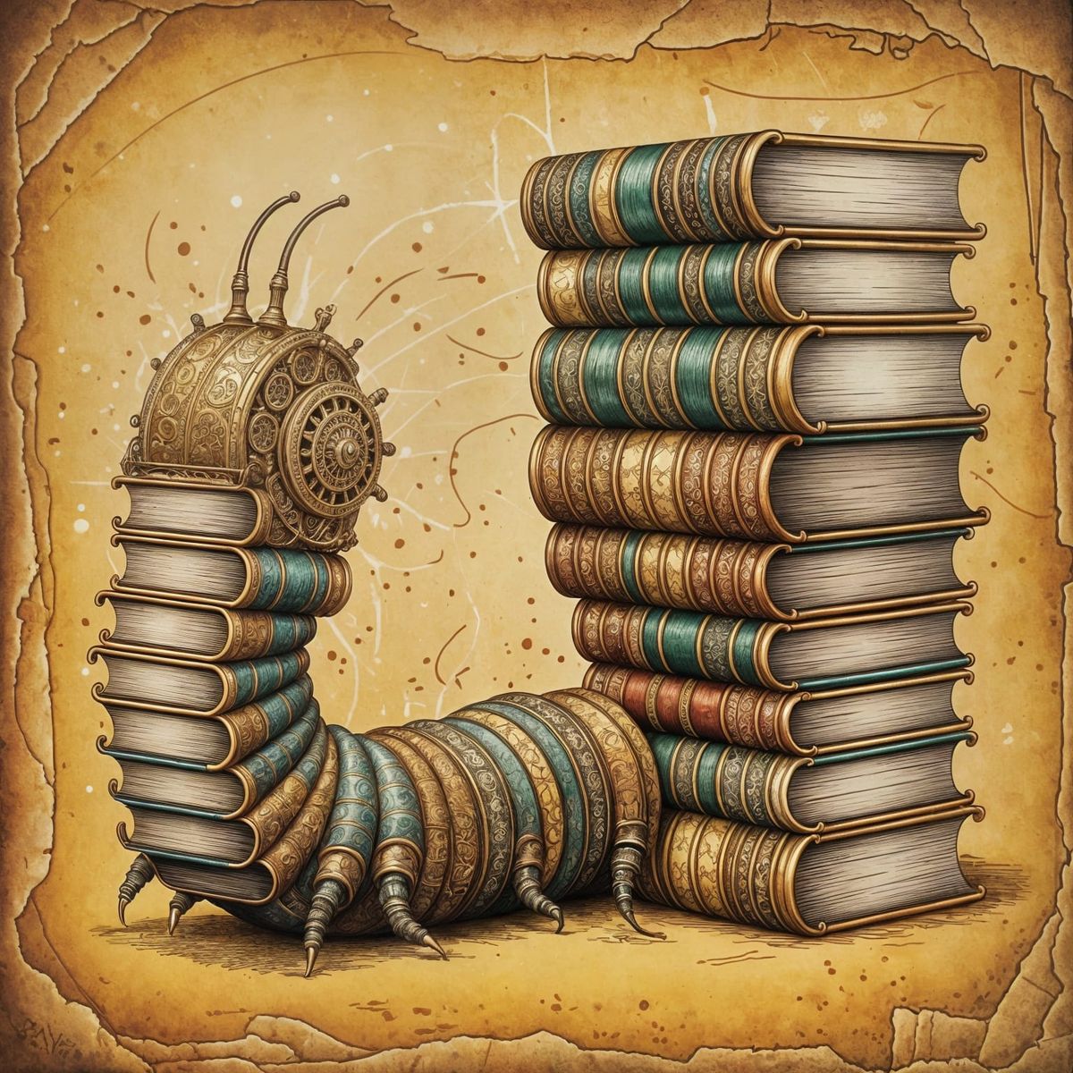 A whimsical illustration of a worm composed of stacked books, adorned with gears and clockwork mechanisms, set against a textured, yellowed parchment background, evoking a steampunk aesthetic.