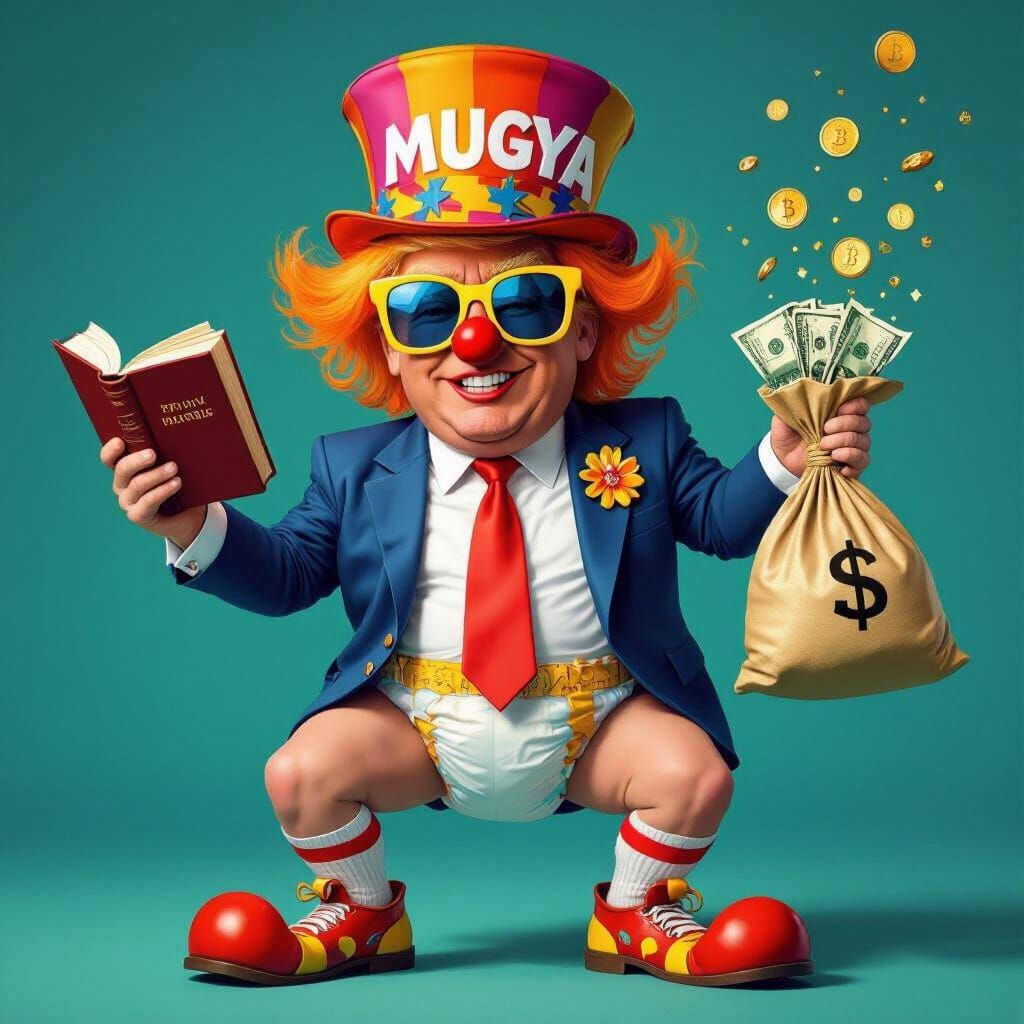 This image shows a caricature of Donald Trump dancing with exaggerated features. The artwork is reminiscent of Ralph Steadman's whimsical style, featuring bright colors and satirical elements.