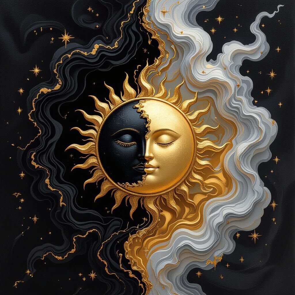 A captivating image of black velvet with swirling gold and silver smoke in harmony. A sun and moon are fused in the center, rendered as polished metal with intricate oil painting details, creating a luxurious, mystical atmosphere.