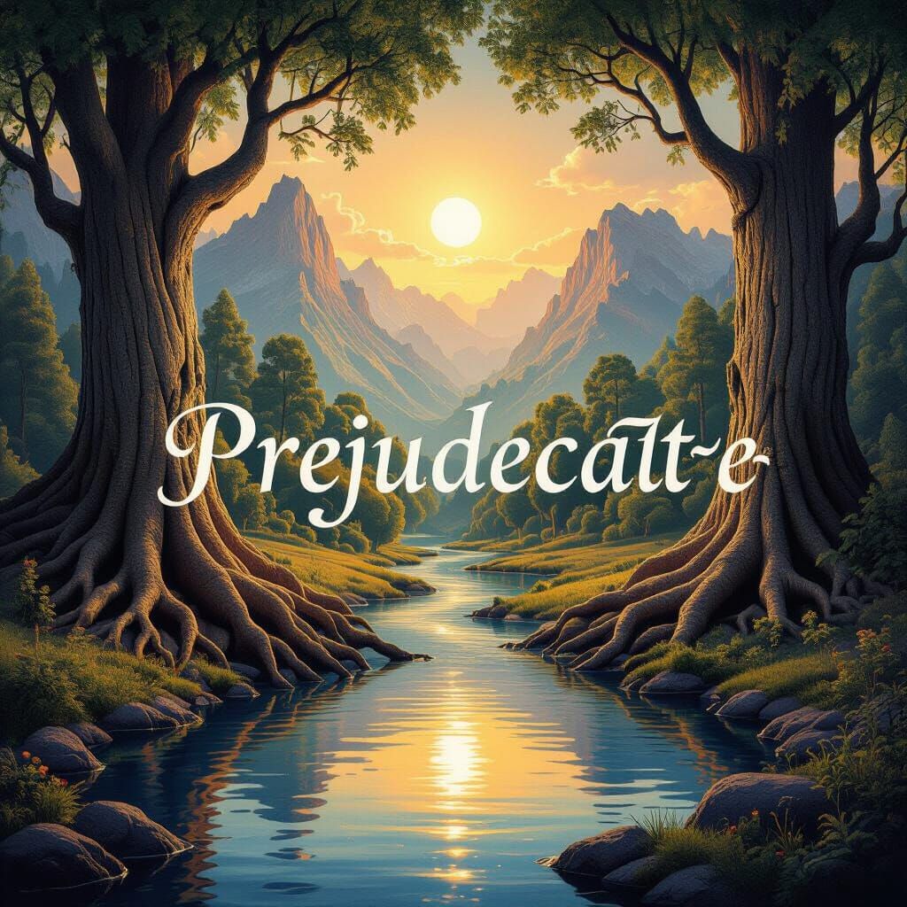 This image shows a dreamlike landscape with ancient trees, a river reflecting the sun, and majestic mountains. The word 'prejudecată' is subtly integrated, rendered in a surrealist, magical realism style with rich colors.
