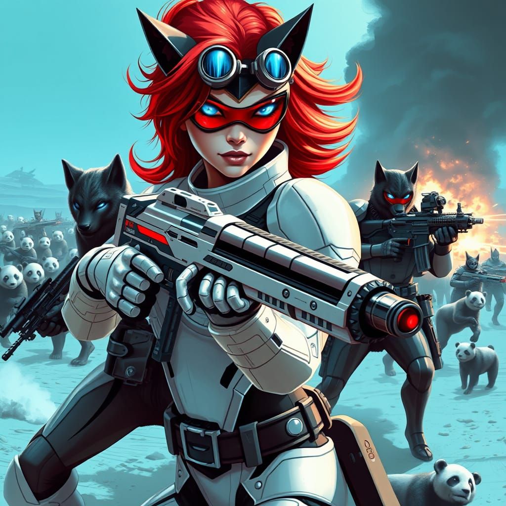 A stunning image of a red-headed Princess Cat Woman, clad in high-tech white armor, leading her team of black wolfmen into battle against a legion of primitive panda men. The scene is set against a vibrant blue backdrop, with advanced firepower and cutting-edge technology on full display.