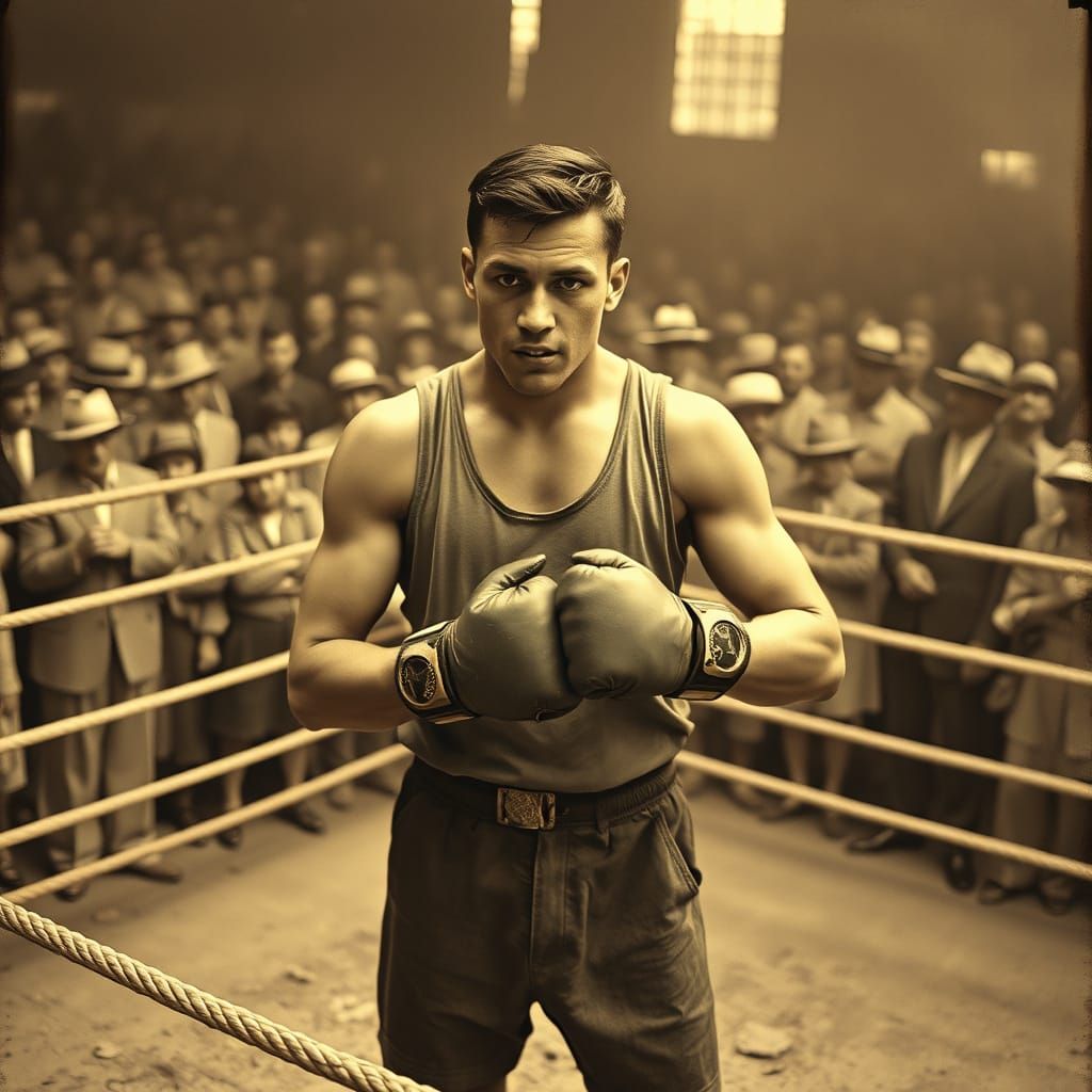 This image shows a sepia photograph of a boxer in a 1920s-era dirt ring. The boxer wears worn gloves and a sleeveless shirt, surrounded by a crowd in vintage attire.