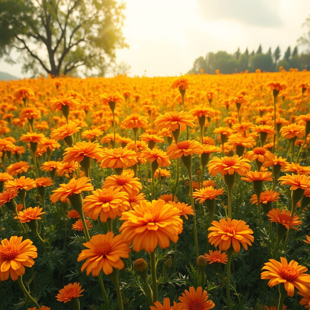 This impressionistic artwork captures a field of marigolds under soft, diffused light. Vibrant orange and yellow hues dominate, creating a cheerful and serene atmosphere with visible brushstrokes.