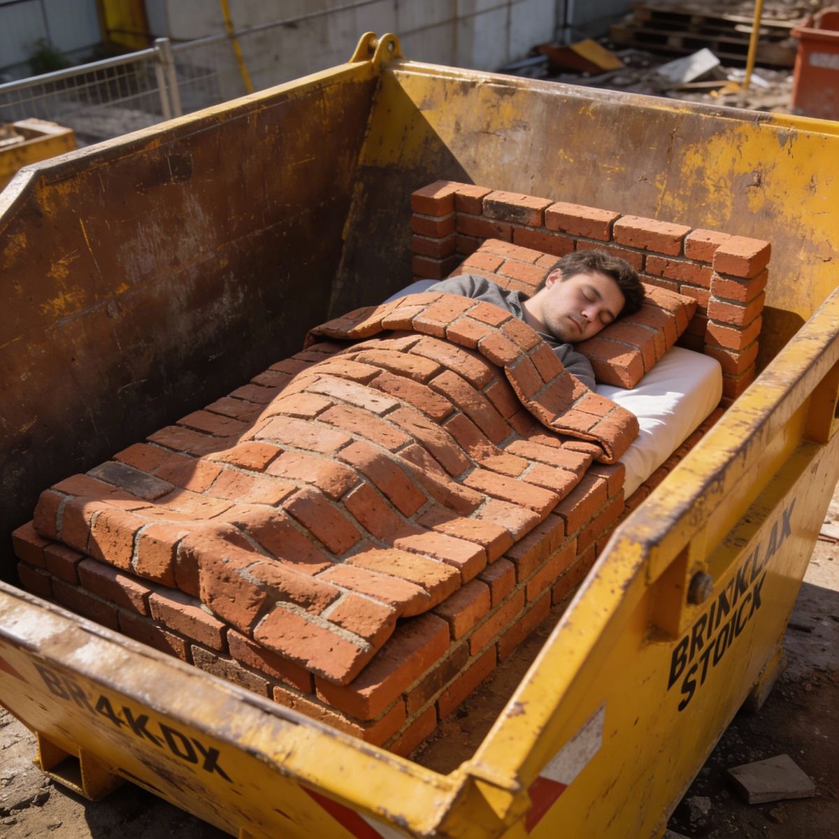 This photorealistic image depicts a person sleeping soundly in a bed constructed entirely of bricks, with a brick duvet that drapes like fabric. The scene is set within a large, yellow British skip.