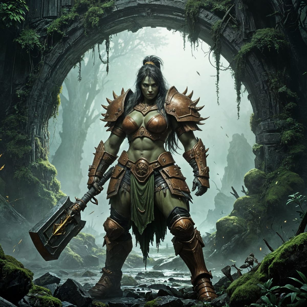 A realistic image of a gorgeous hulking, muscular female barbarian warrior , forged from living green earth, stands guard before a colossal, moss-covered portal. The portal shimmers with arcane energy, hinting at untold realms beyond. His armor is a patchwork of rusty dark orange and black, accented ...