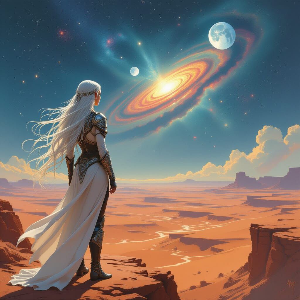 This image shows a lone elven woman with silver-threaded hair gazing over an alien desert. Her attire suggests adventure, with a cosmic nebula and twin moons overhead, rendered with airbrushed gradients.