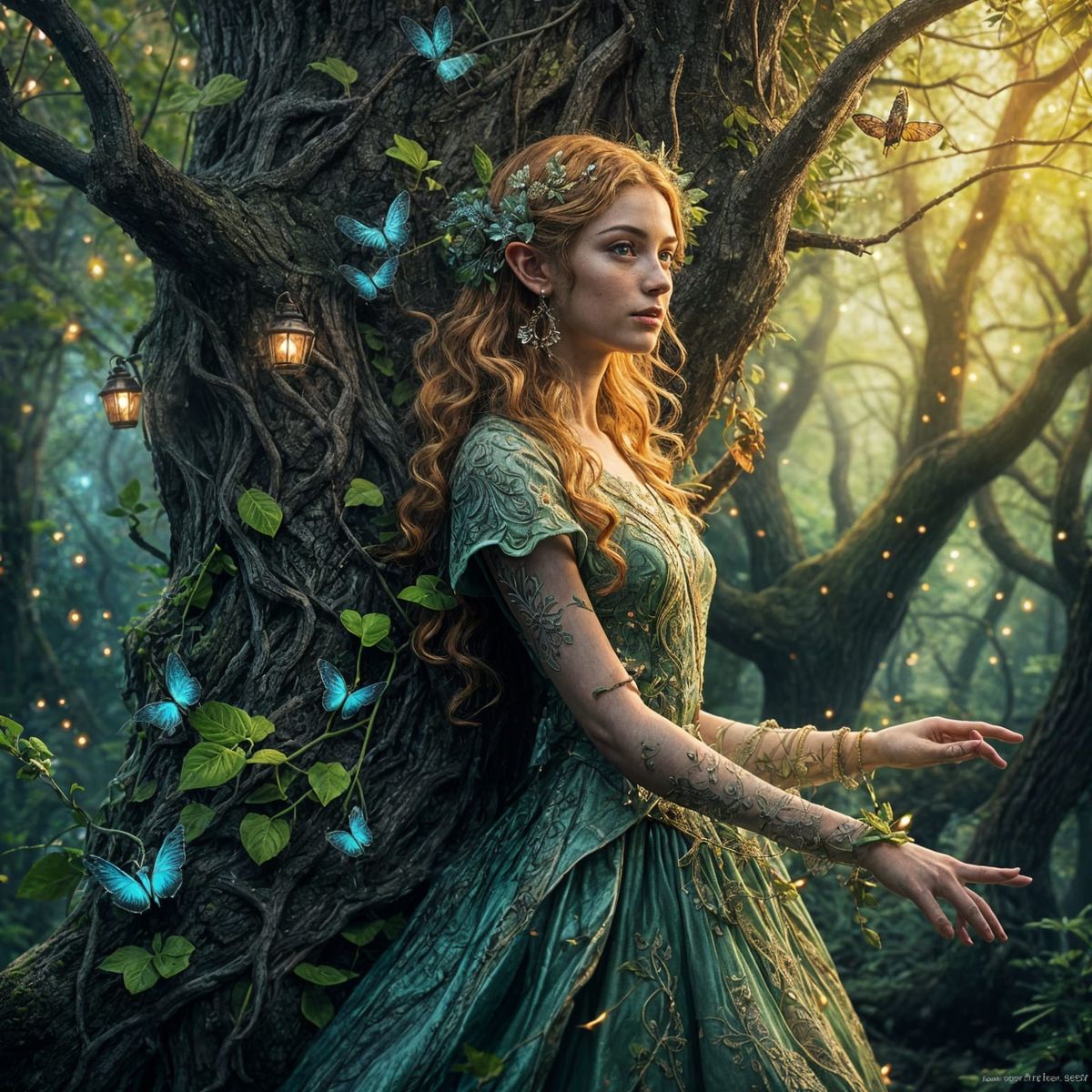This enchanting image depicts a beautiful elf maiden ascending a tree, surrounded by a whimsical forest setting and fireflies that glow in the evening light, showcasing intricate details and a sense of fun and wonder.