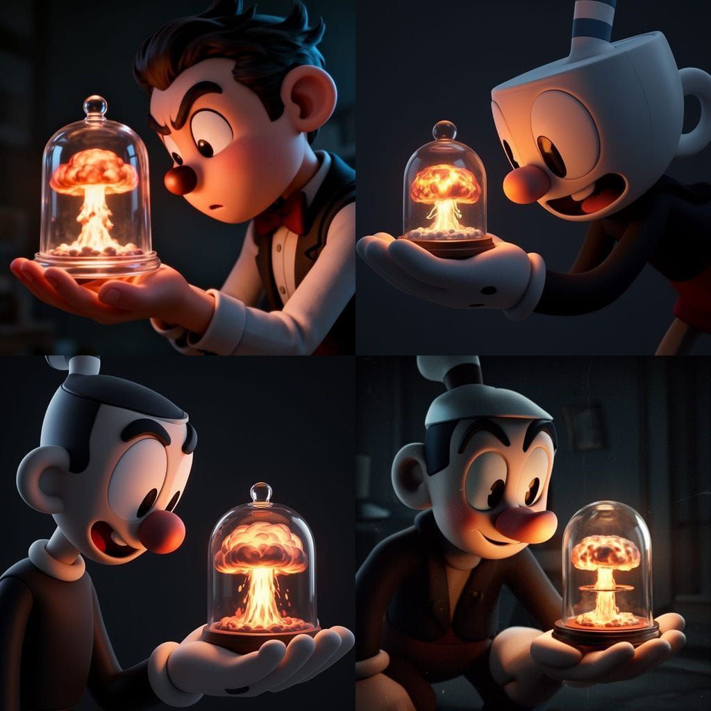 This image features a male, anthropomorphic character in a vintage rubberhose animation style, holding a glass jar containing a nuclear explosion. The scene uses a low-saturation palette with dramatic lighting.