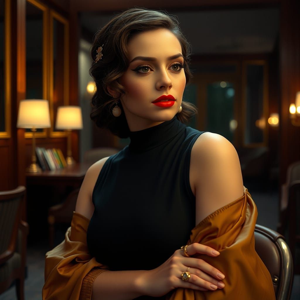 A striking picture of a woman in elegant attire, posing in a sophisticated setting. The image is reminiscent of live-action film with cinematic lighting and intense film grain.