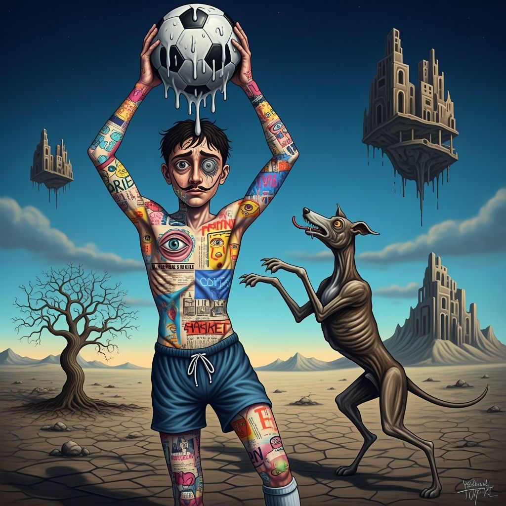 This image shows a tall young man in a dynamic pose, holding a ball above his head, with a dog jumping towards it. The style is inspired by surrealism and expressive brushwork.