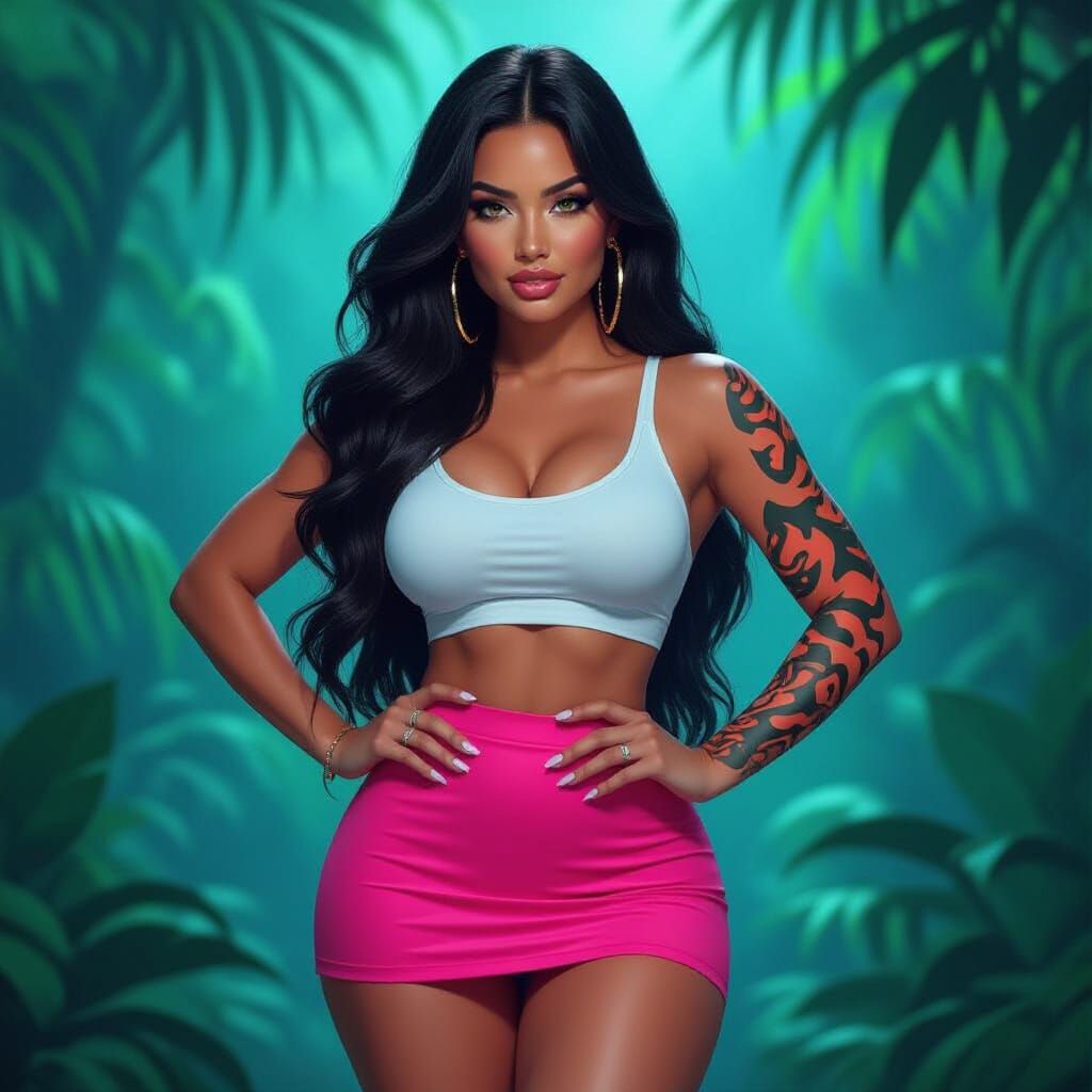 This image shows a confident Latina woman with neon green leopard spots in a jungle. She is wearing a pink dress and white crop top with bioluminescent tattoos, rendered with vibrant neon colors and intricate detail.