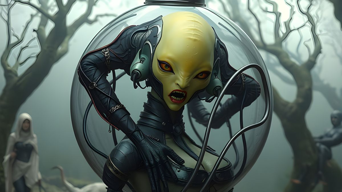 This image depicts a biomechanical alien creature trapped in a glass sphere amidst an ancient woodland. The creature's yellow skin and red eyes evoke a sense of foreboding, while the hyperrealistic rendering adds to the eerie atmosphere.
