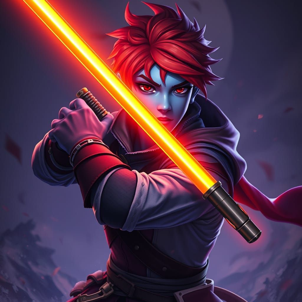 A detailed matte painting of a young Chiss warrior with blue skin and red hair, wielding an orange lightsaber. This fantasy concept art features a striking color palette and intricate detail, presented in high fidelity.