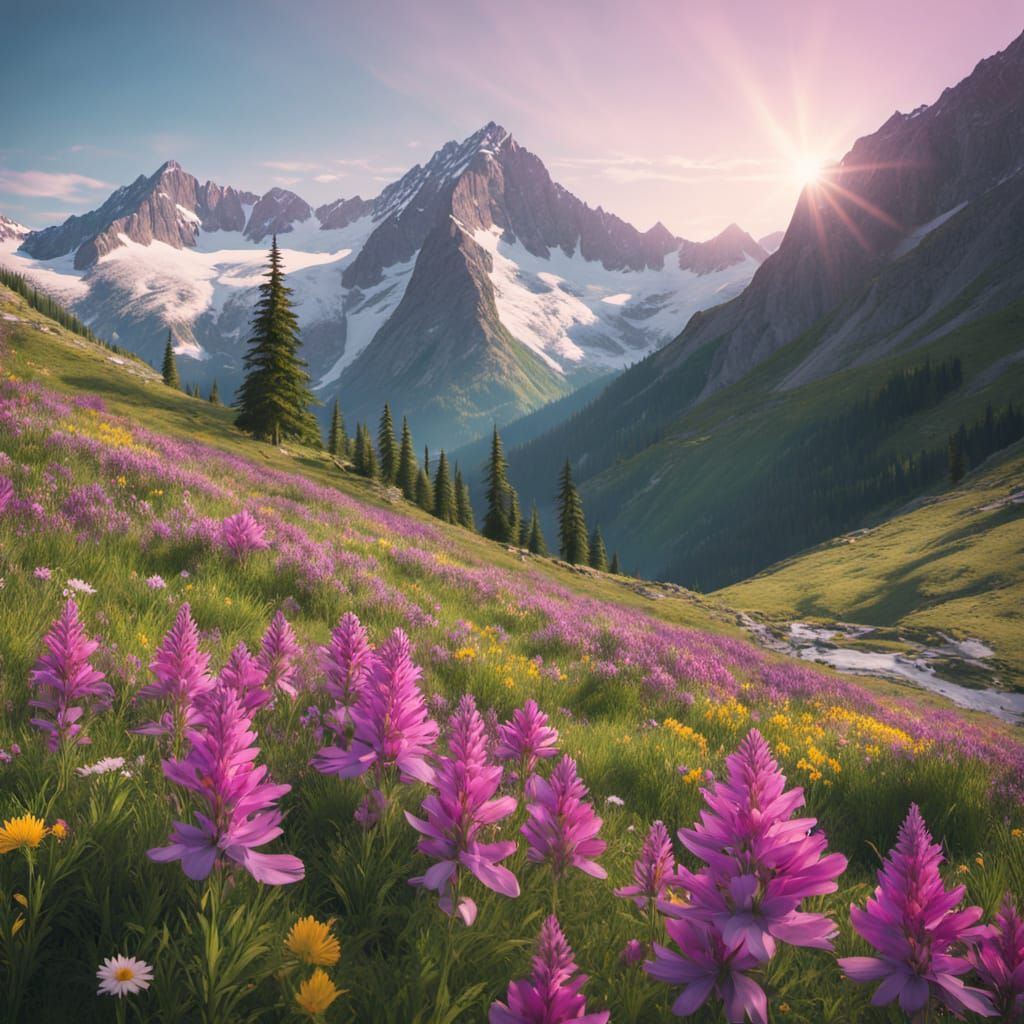 This breathtaking image captures a majestic mountain valley in mid-spring, featuring lush greenery, vibrant wildflowers, and majestic wildlife in a peaceful atmosphere of warm golden light and crisp detail.