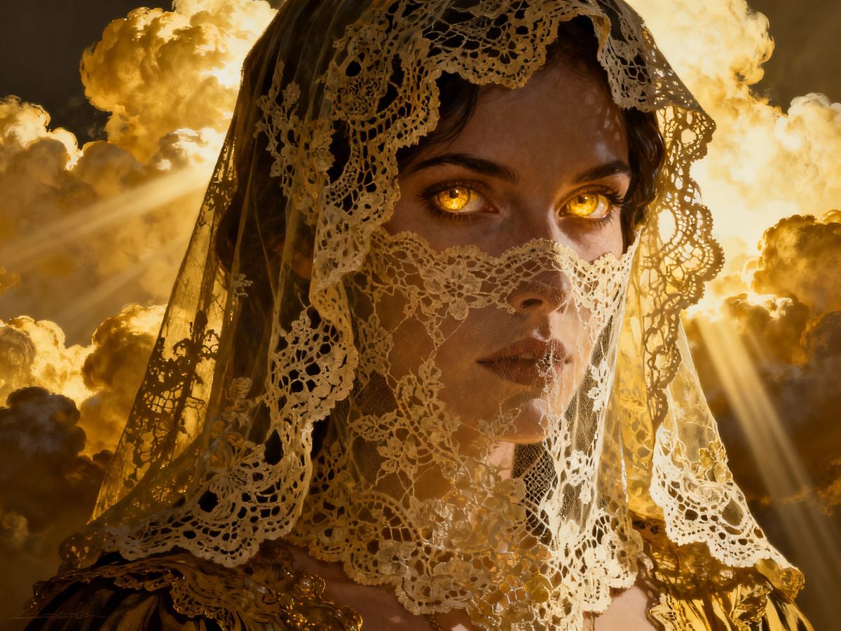 A stunning portrait of a woman with luminous golden eyes, veiled in antique lace. Golden clouds and light create a dramatic, ethereal atmosphere.