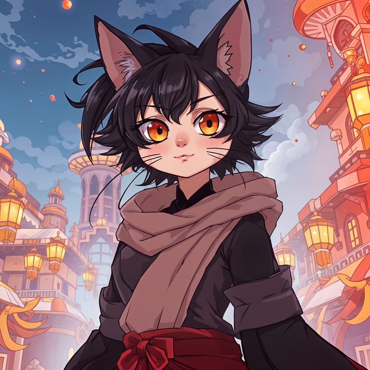 A striking picture of a tall, curvy, anthropomorphic cat with black fur and red-orange eyes, dressed as a fantasy monk. The cat stands in a vibrant Arabian city in a flat manga scan style.