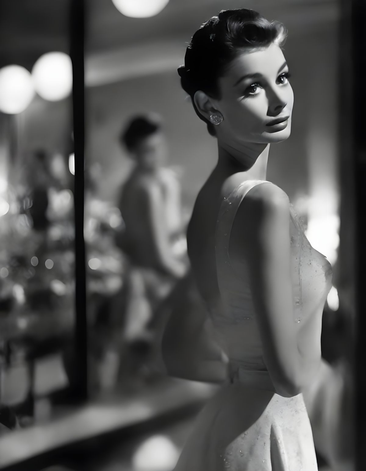 This image captures the essence of Audrey Hepburn's timeless elegance, with a focus on her refined features and poise, reminiscent of 1950s Hollywood glamour.