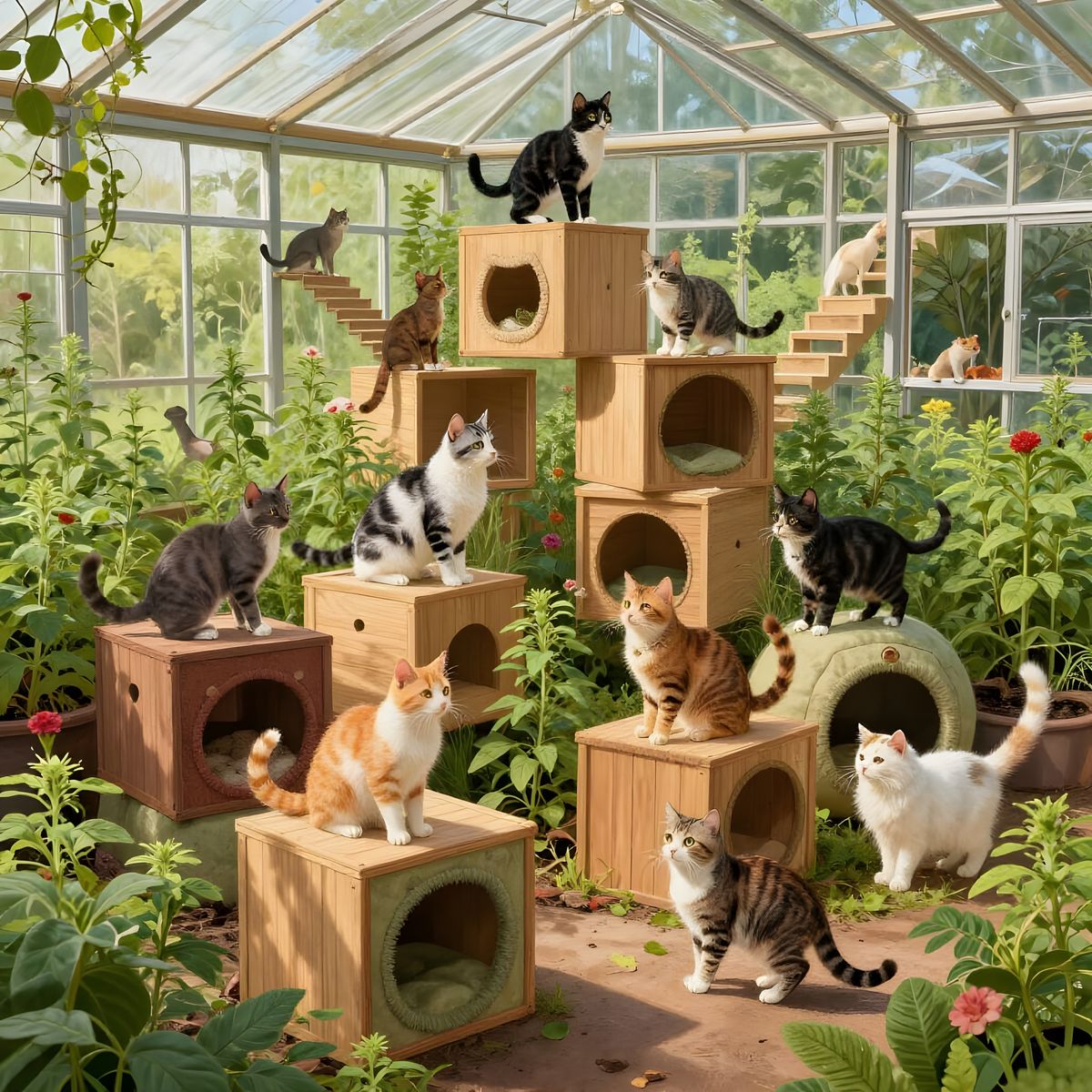This image shows assorted cats playing within a complex, maximalist greenhouse filled with catnip and climbing structures. The scene features numerous wood boxes and fabric caves.